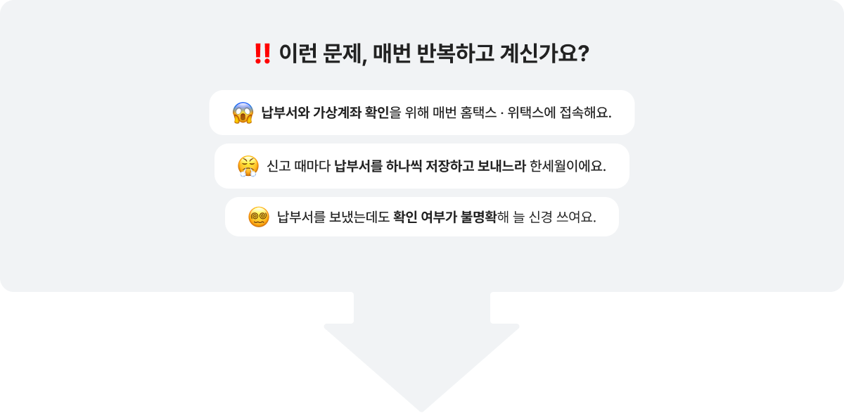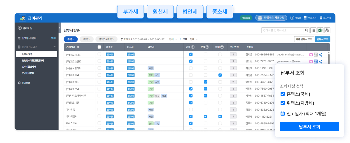 부가세, 원천세, 법인세, 종소세 등 주요 세목 납부서를 클릭 한 번에 일괄 수집!