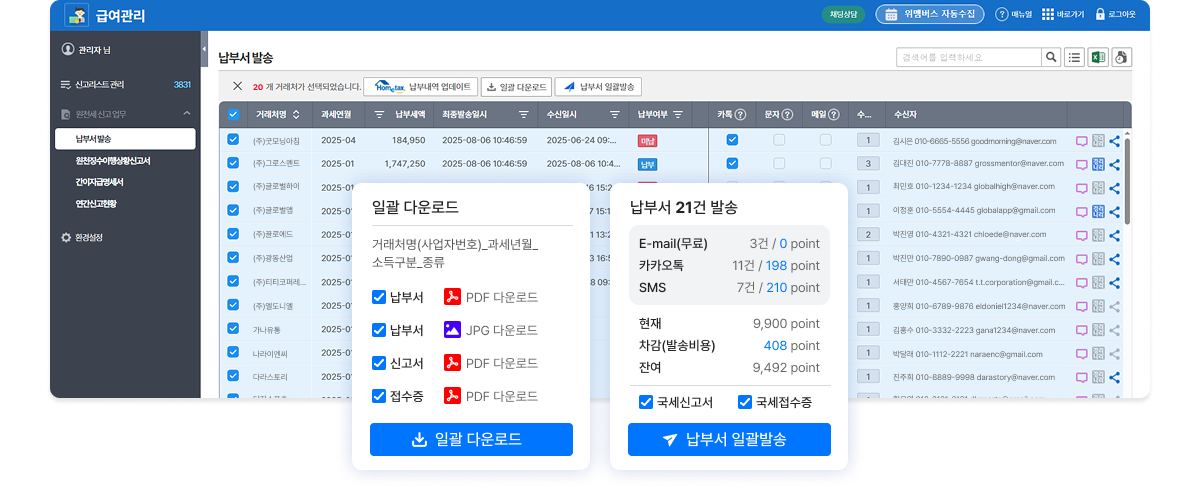 납부서 일괄 다운로드 및 발송 (PDF/JPG)